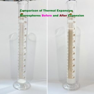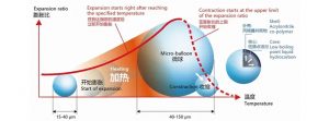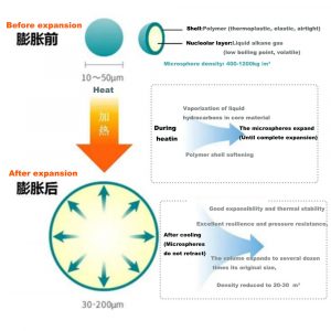 Expansion Principle: At room temperature, the microsphere shell remains rigid. When heated, the liquid hydrocarbon gradually vaporizes as temperature rises, increasing internal pressure. Upon reaching the polymer shell’s glass transition temperature, the shell softens. Driven by the pressure differential between interior and exterior, the microsphere begins to expand until equilibrium pressure is achieved, halting expansion at maximum foaming state. Continued heating reduces the mechanical strength of the polymer shell, causing the microsphere to shrink and rupture, releasing the gas contained within. (Image source: Sekisui Chemical Advancell EM)
